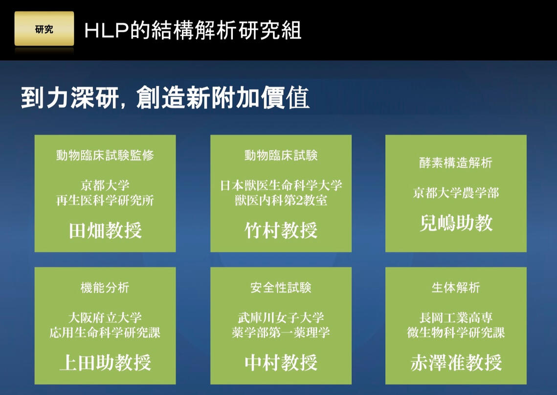 - 京東大學再生醫學研究所 田畑教授 (動物臨床試驗監修)- 日本獸醫生命科學大學獸醫內科第2教室 竹村教授 (動物臨床試驗)- 京東大學農學部 兒嶋助教 (酵素構造解析)- 大阪府立大學 應用生命科學研究 上田助教授 (機能分析)- 武庫川女子大學藥學部第一藥理學 中村教授 (安全性試驗)- 長岡工業高專微生物科學研究課 赤澤准教授 (生體解析)