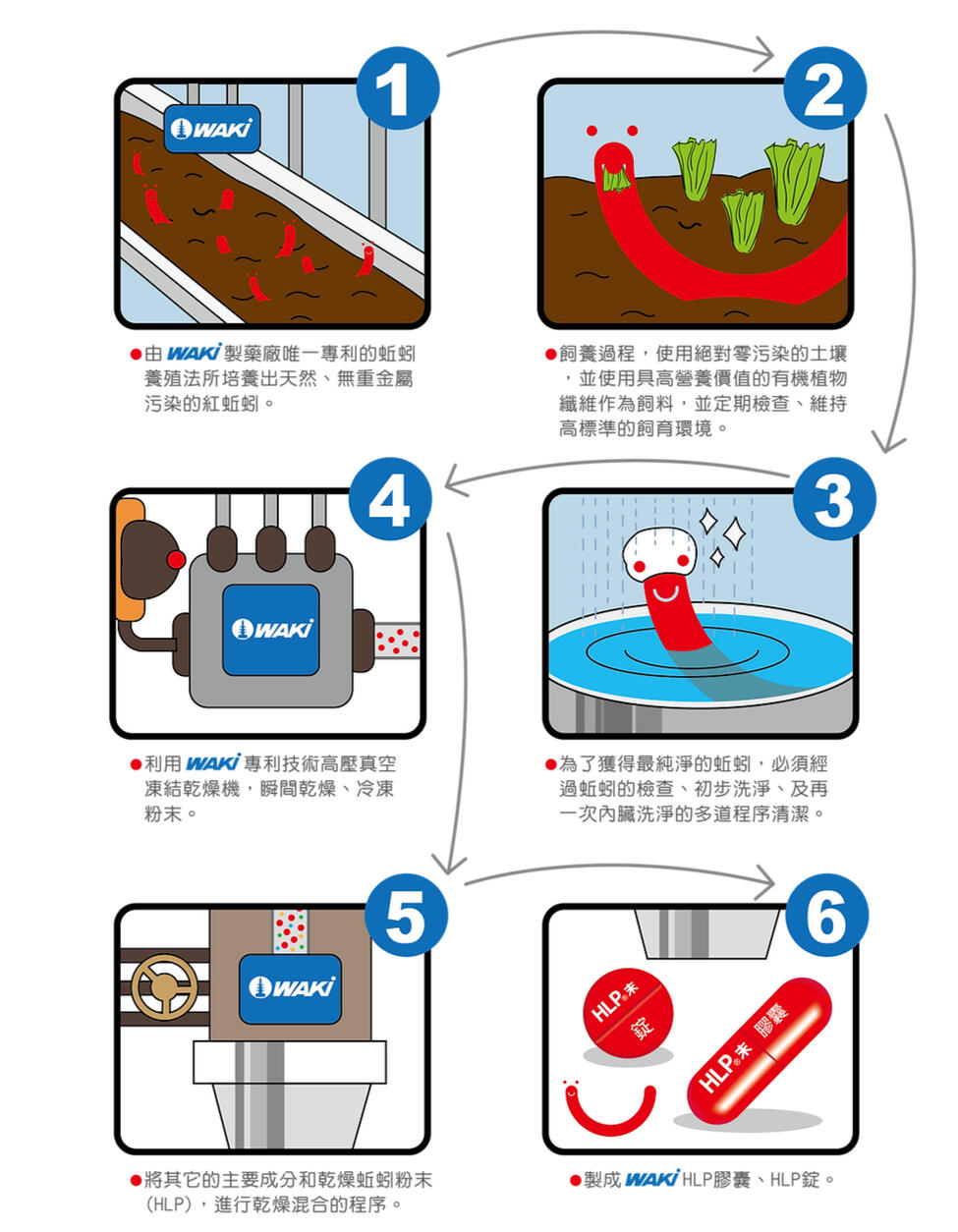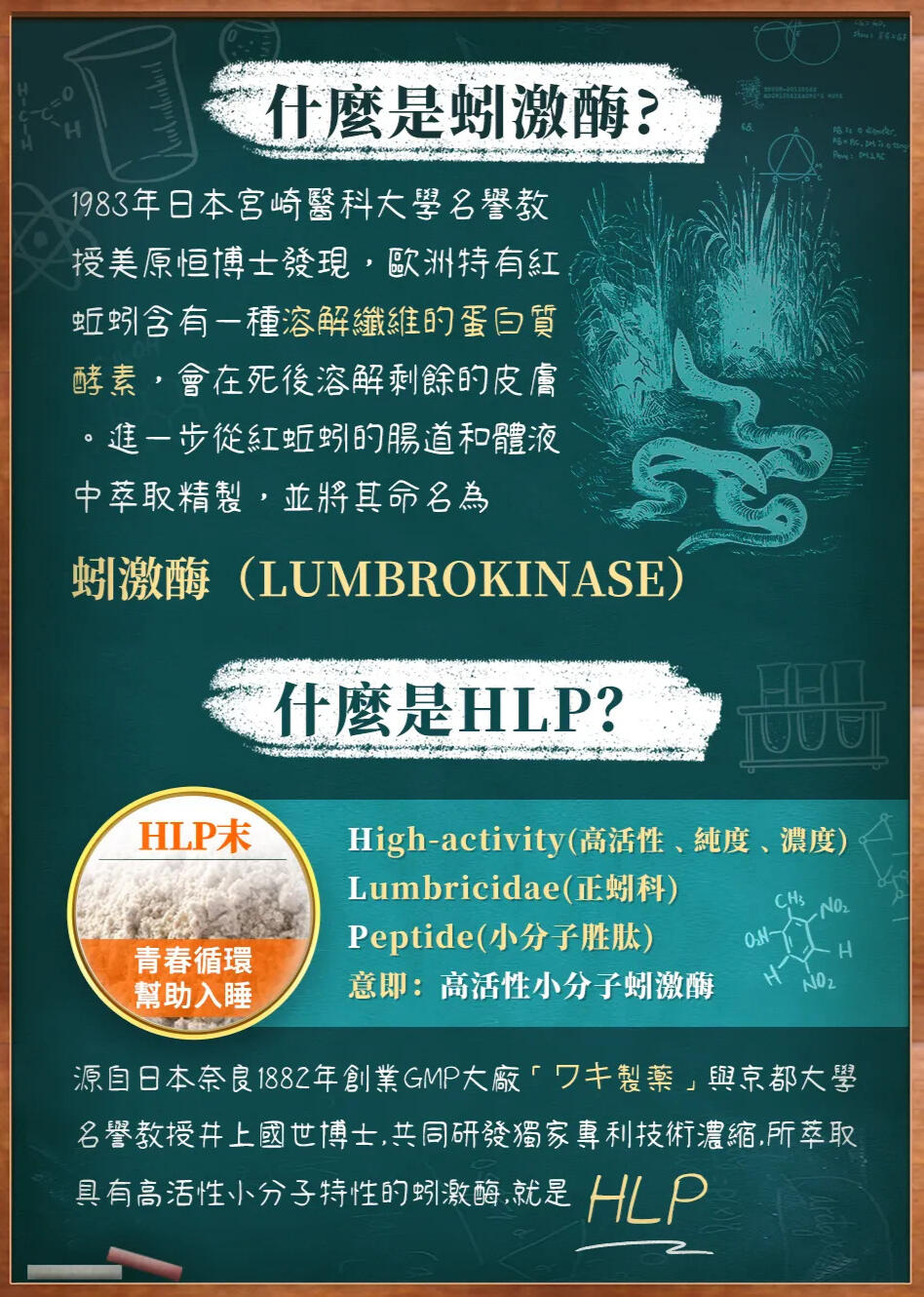 經過超過一個世紀的持續探索,WAKI 藥廠發現蚯蚓體內含有一種活性酵素,名為「蚓激酶(Lumbrokinase)」,並將其活性產物命名為「HLP」。研究證明,HLP 在多方面具有顯著的健康效益,包括:- 改善血液循環