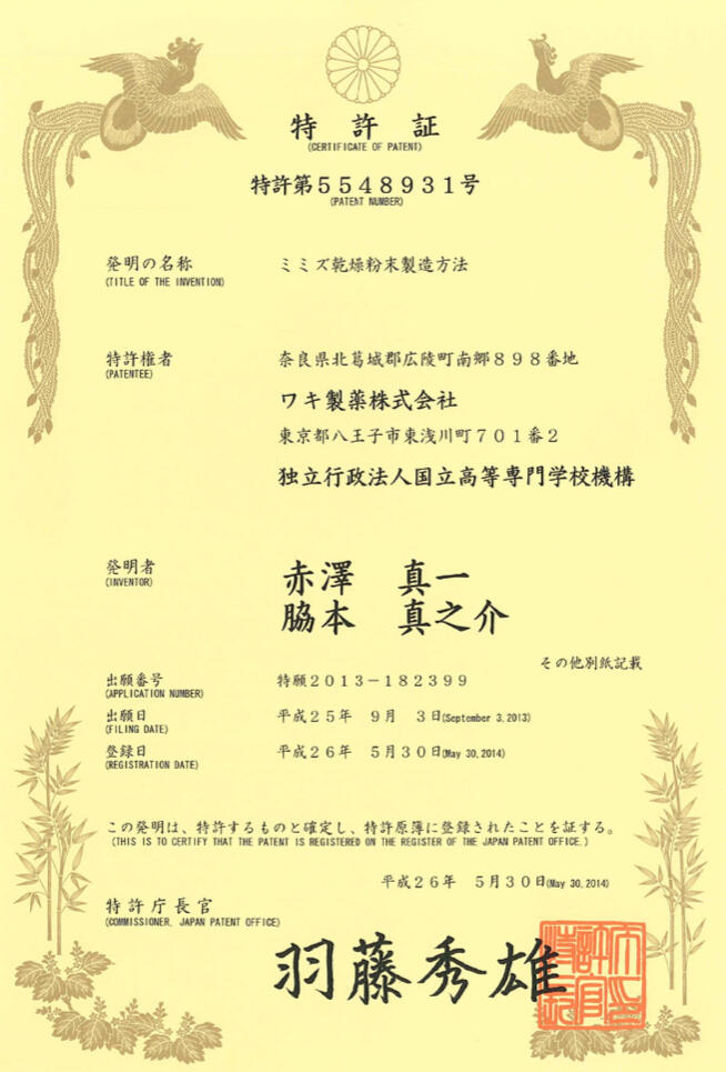 | Manufacturing Method for Dried Earthworm Powder(High pressure treatment) | Japan, Taiwan, Hong Kong, China, USA |